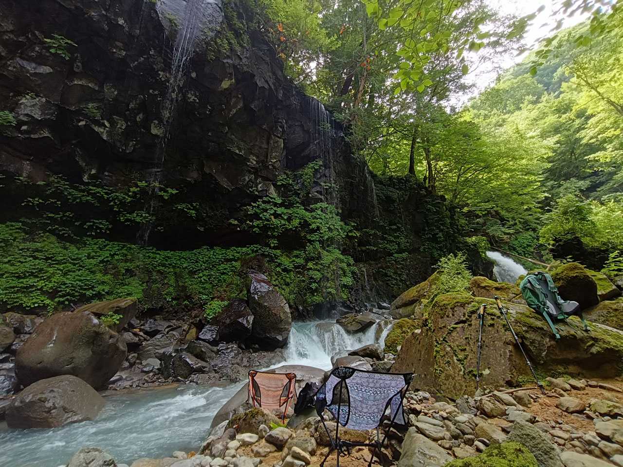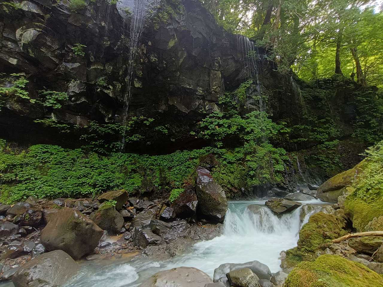 仁三郎の滝はすこし遠いですが、目の前の岩壁から滴り落ちる幾筋もの水流がとてもいい感じでした。