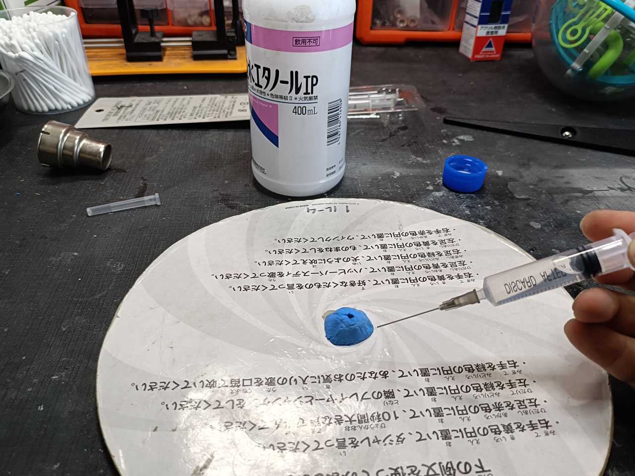 紙粘土が何で接着されているのか良く分からないのですが、とりあえず注射器を使って比較的無害な無水エタノールを紙粘土とルーレットの隙間に注入して剥がしていきます。