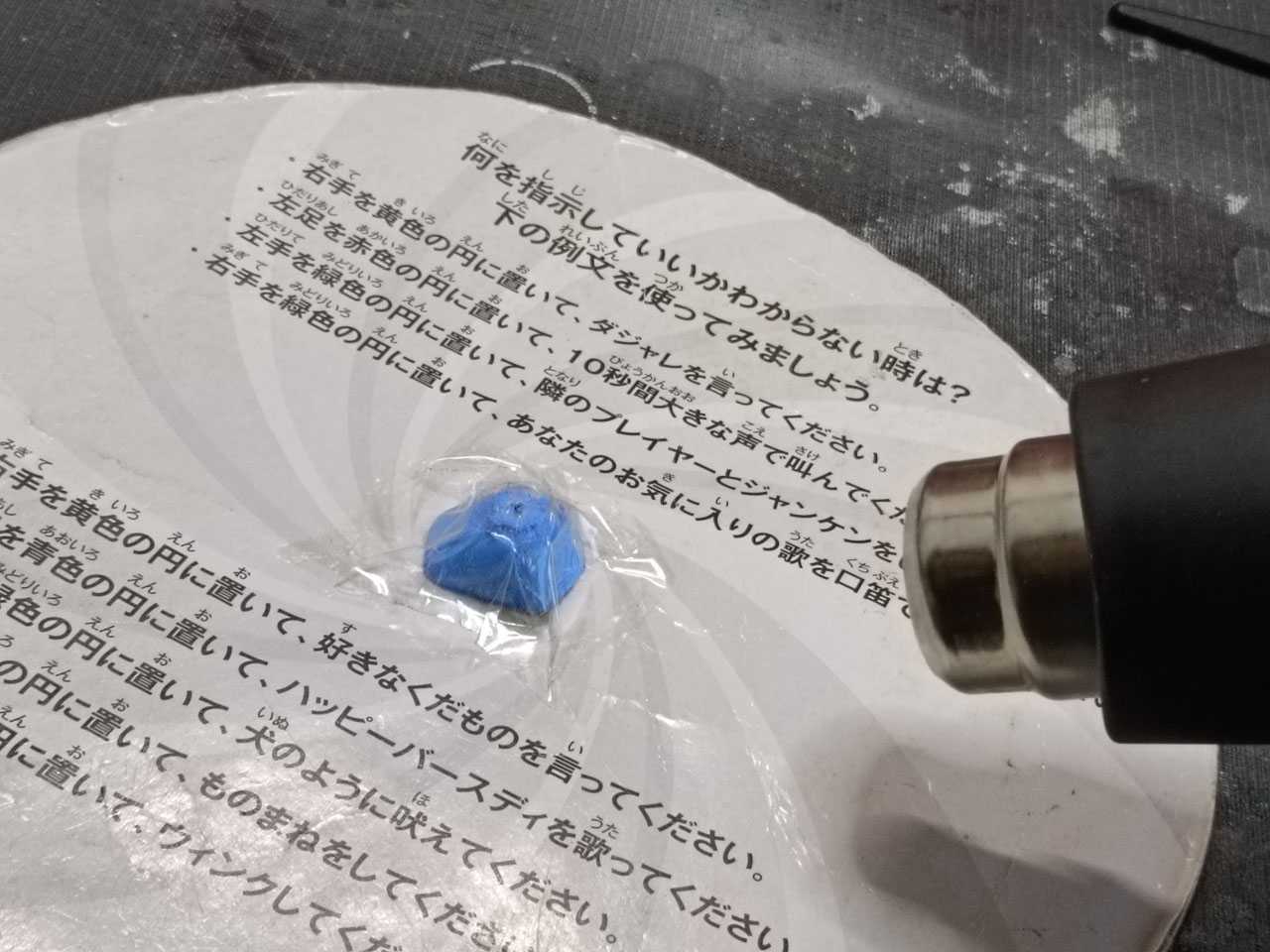 という訳で、まずは裏側の紙粘土を固定しているテープをヒートガンで温めて粘着力を弱めながら剥がします。