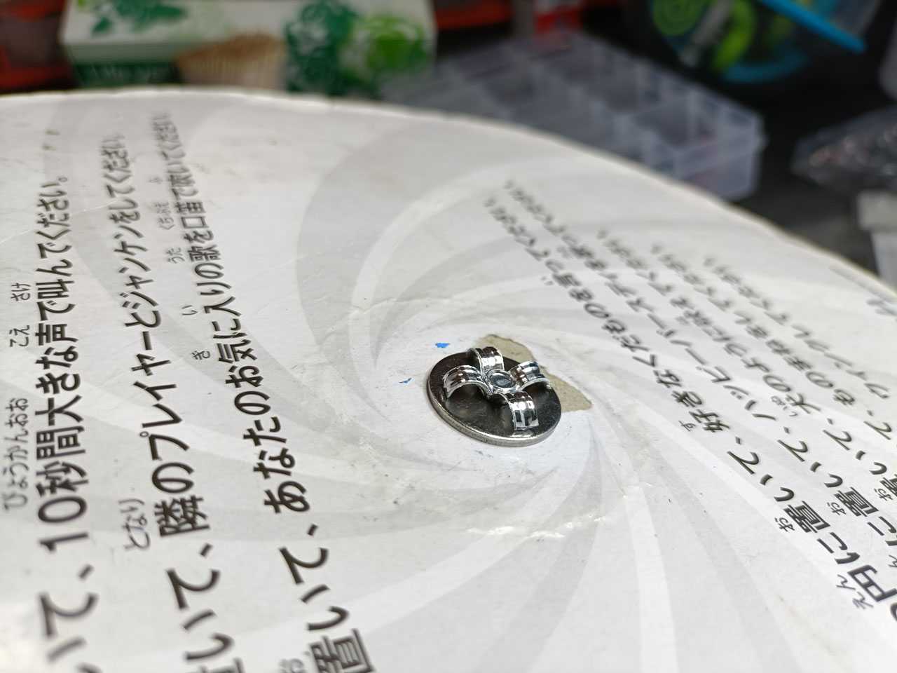 表側からルーレットの針をネジで(完全に締めすぎると回らなくなるので、やんわりと)固定していたようですが、流石に紙粘土にネジで固定は無理があるでしょう。