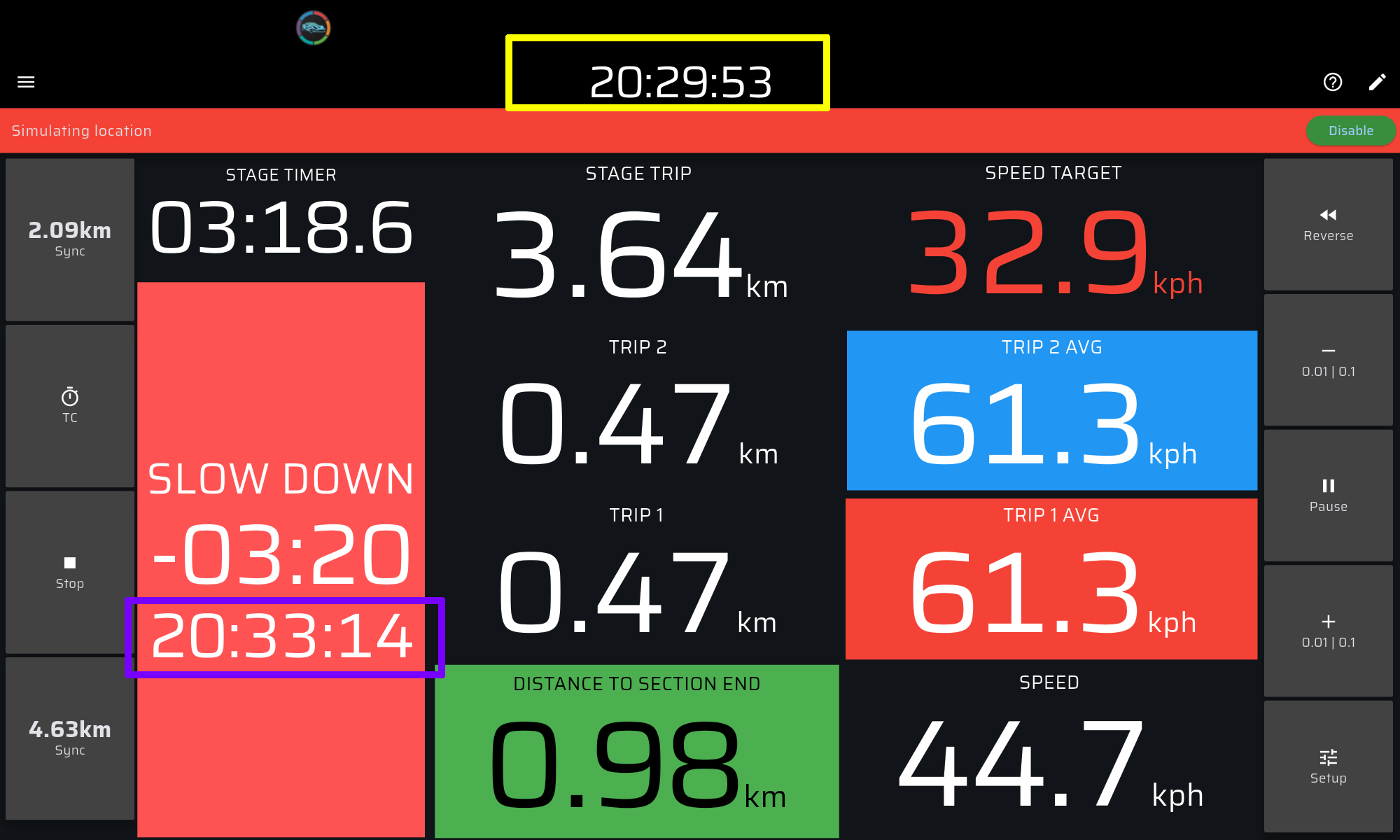 画面左側のペース指示下部、紫枠に表示されているのが、予めセットしておいたデータから算出した、「現在地を通過すべき理想の時刻」です。