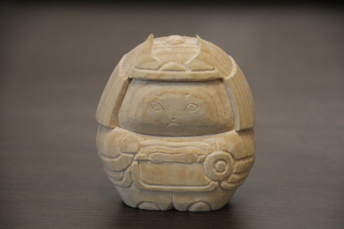 4作目、童大将です。この時、彫刻刀の研ぎでスランプに陥り、奇麗な仕上げが出来ませんでした。でも、ここで悩んだ事で、研ぎが彫る事と同じくらい大事な事だと気付き、あとの作品に生かされました。2013年12月頭完成。 材:木曽檜(板目)