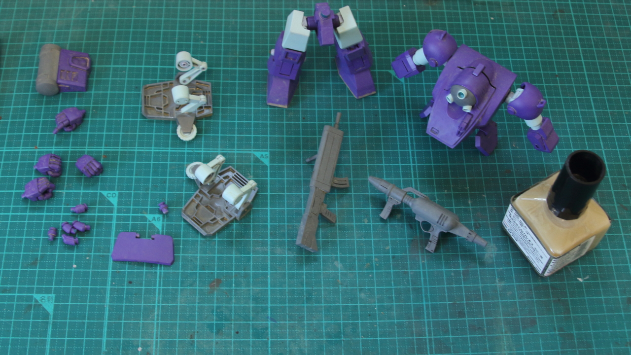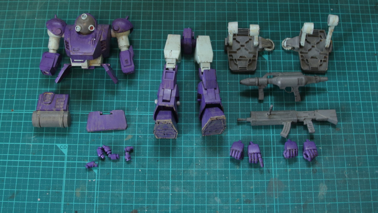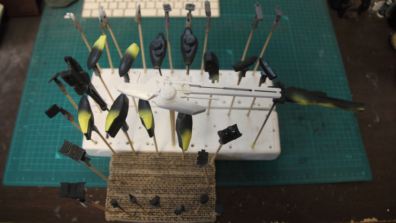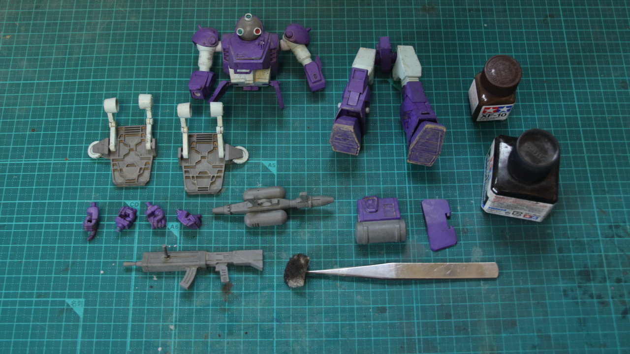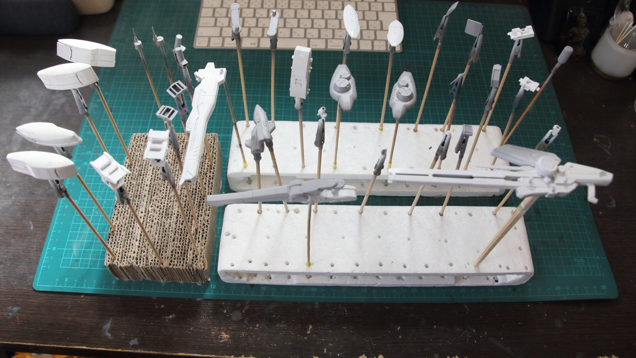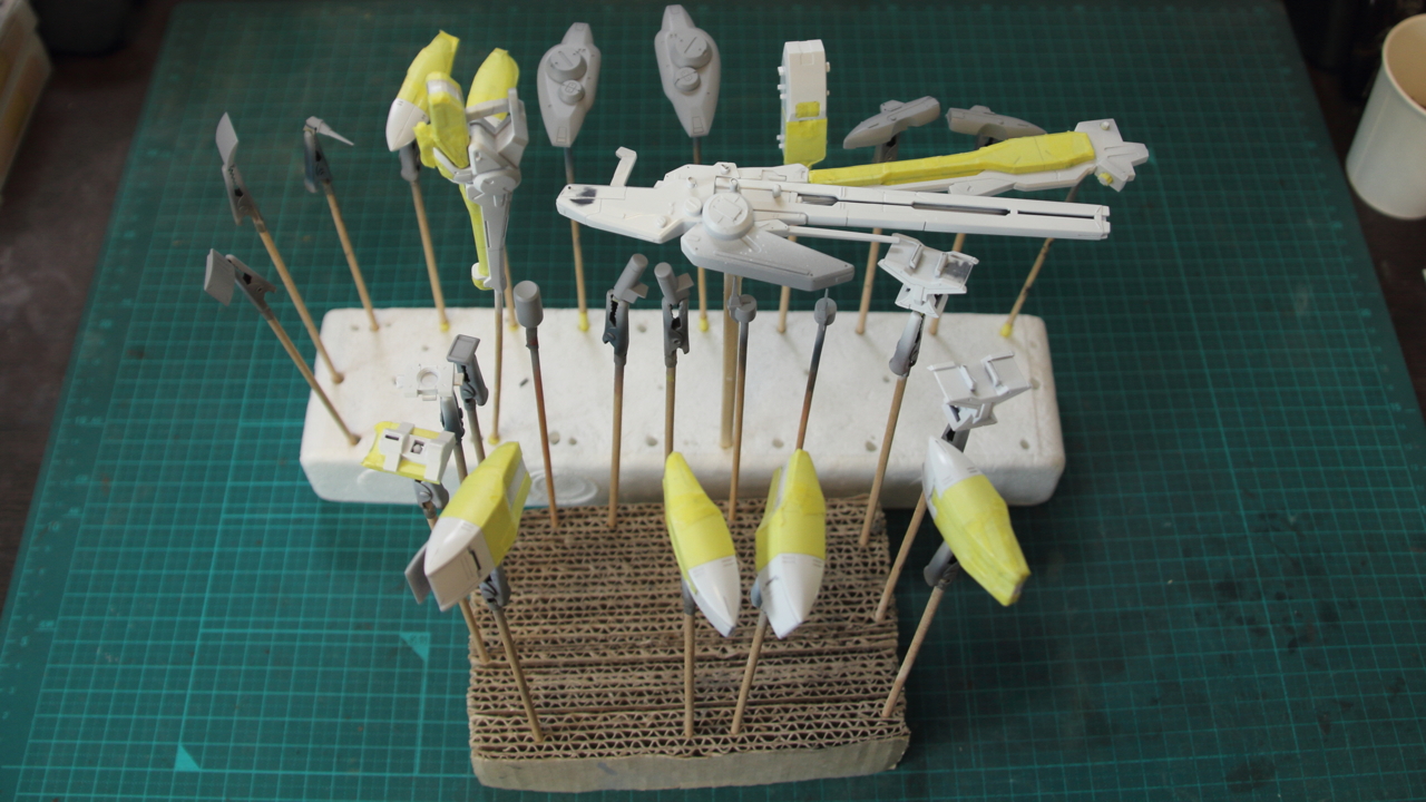 長いことサフ吹きっぱなしで片付けずに置いていましたのでいざ再会しようとしましたがパーツが何個か無くなっているようです。この状態ですから致し方なし。でも説明書でパーツ確認するが無くなっているのは1つのみ。後々紛失パーツが判明するかもしれません。で、落ち込んでもしょうがないのでジャンクパーツから流用できるものを探しました。まあ、こんな感じでいいかな。いきなり出鼻を挫かれましたが自業自得じゃい。