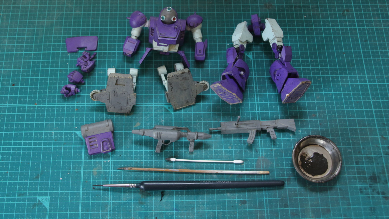 本体の汚れ塗装ですが、エナメルのせいか気温が低い所為で乾燥が遅く、硬化していないと次の工程で剥がれてしまうので先にカン・ユーさんの塗装をします。ベースは吹き付けてあるので筆にて着色。相変わらず下手ですが普段は隠れてそう見る機会はないので良しと。こちらは乾燥後コックピット内と一緒に汚し塗装していきます。今まで放ったらかしでしたのでそんなに焦る必要はないですわな。
