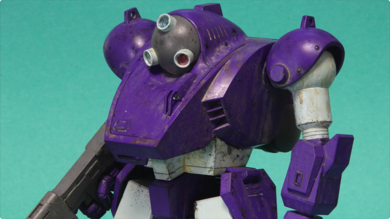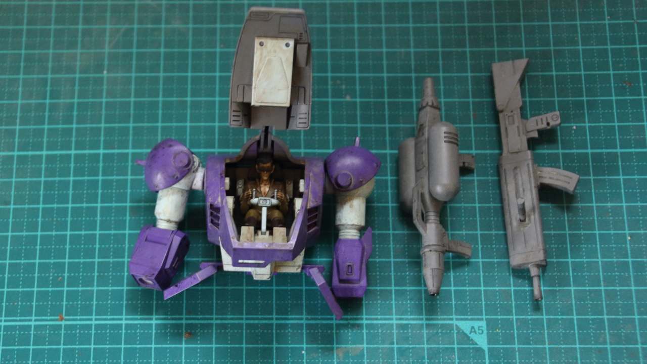 コックピット内の汚しです。ブラウン系にてウォッシング、カンユーさんも。あと武器は銃口をウェザリングマスターで使用感を出します。あとはアイカメラにクリアパーツをはめます。こんな感じに。あとは乾燥させて組み立てです。