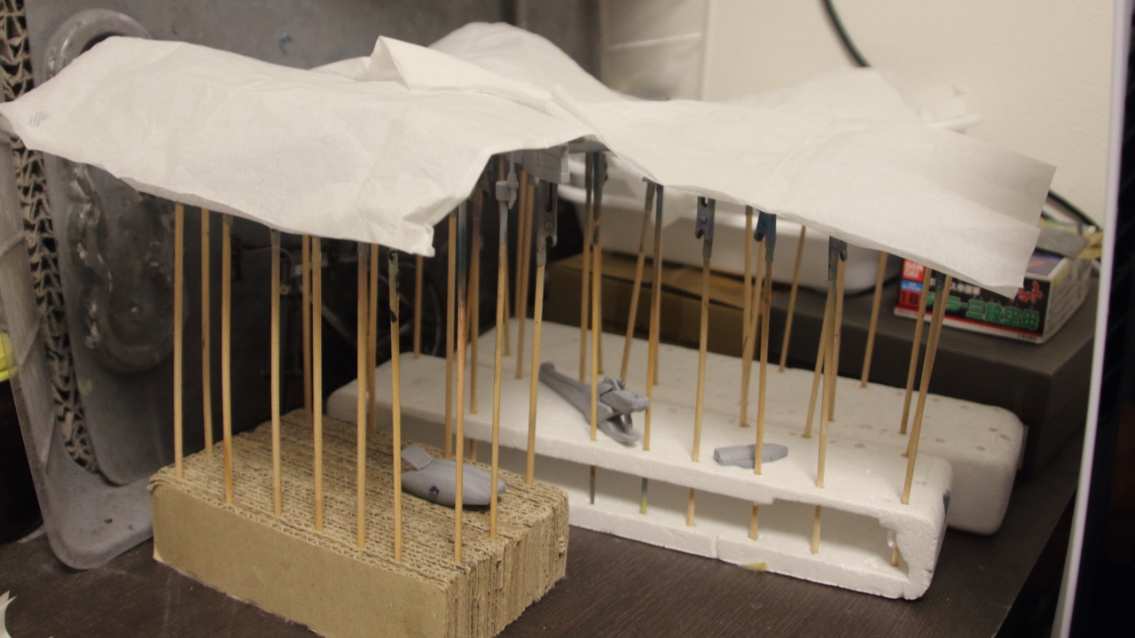 数日置いてチッピングしました。ブラウンとブラックにて行う。写真でも分かりますが後半スポンジがピンセットにて形状作ってはさんでいたんですが外れ、その影響でスポンジがぶれているのに気づかず汚れが粒状にならず汚くなってしまいました。とはいえ、今回は汚目に仕上げる予定ですのでなんとかなるでしょう。