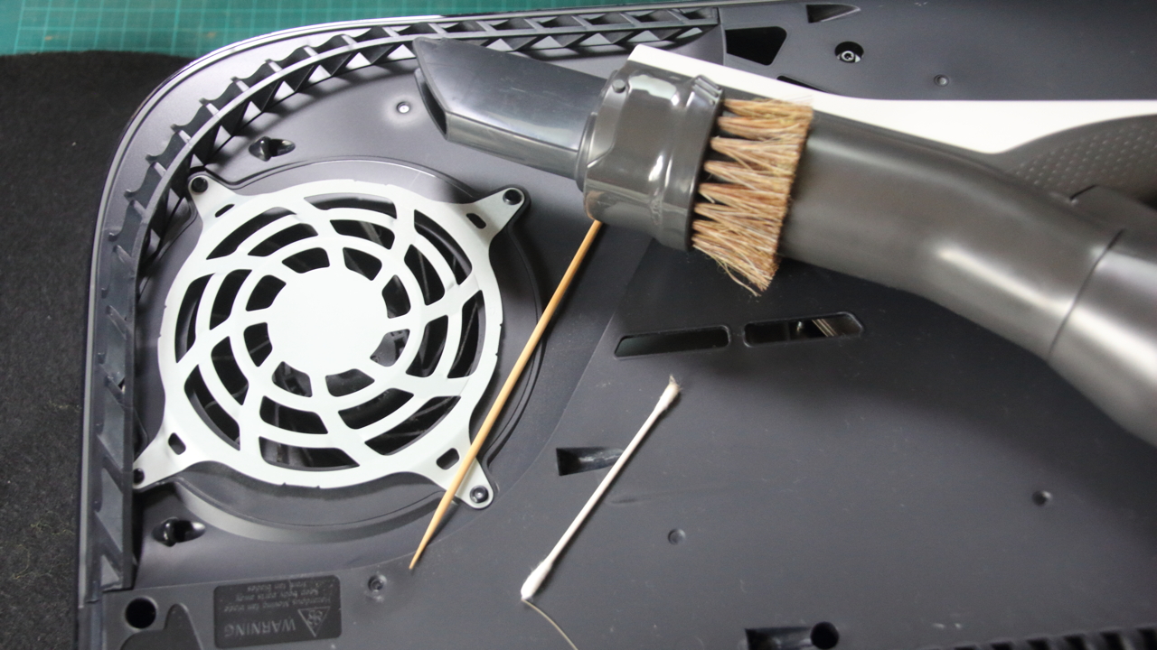 購入から1年と8ヶ月が経ちましたPS5の掃除を行いました。外付けで内部の空気を吸い出すタイプの換気ファンを取り付けたので埃がどのくらい溜まっているか確認します。外カバーが開けづらくネットで調べてなんとか開けられました。ほとんど埃は溜まっていませんでしたが、本体の冷却ファンだけぎょうさん溜まっていました。本体のパーツを指定以外のものを開けると保証外になってしまうので考えまして掃除機強モードで吸いながら竹串と綿棒でファンについた埃を掻き出しました。綺麗になりました。まあ、定期的な掃除は必要ということですね。