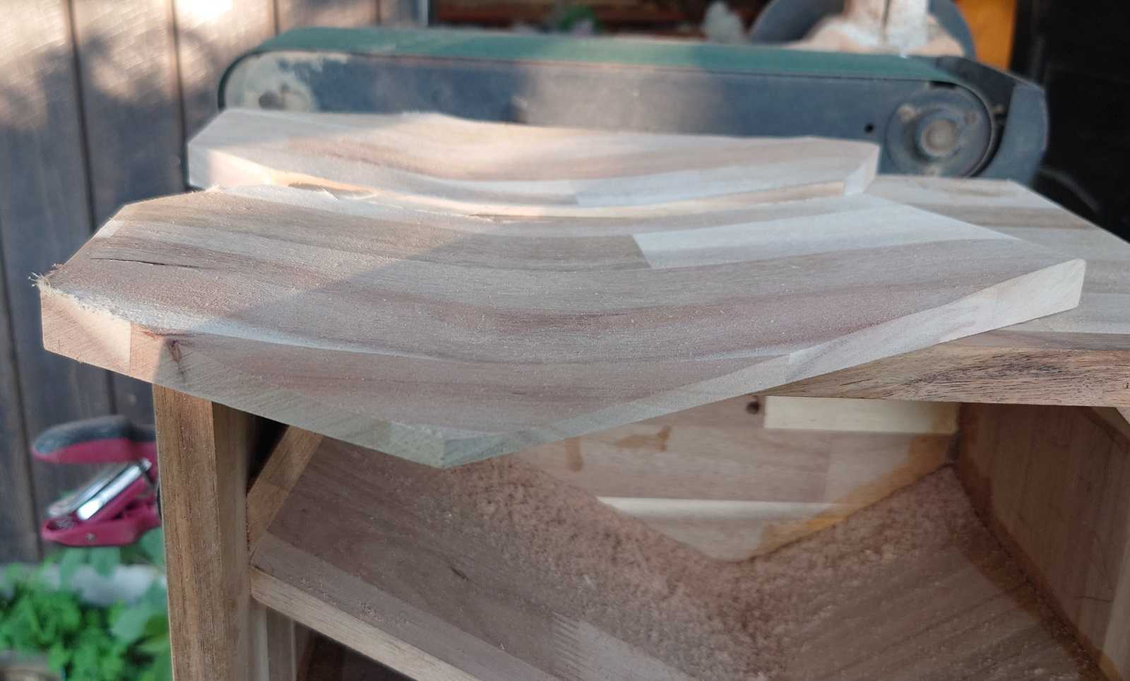 背面には箱内側にこのように真ん中を薄く削った板を張り付けて、前後間でも並行面を作らないようにしています。