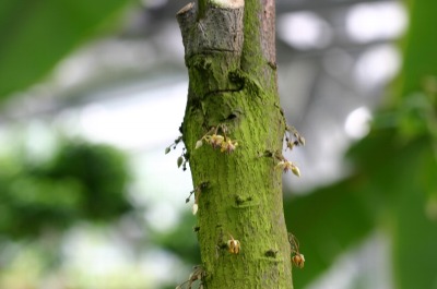 幹が青いアオキ科、いや例のアオギリ科で(総理大臣の桐紋)こんな風に幹に花が咲いています(普通に枝にも咲く由)そういう咲き方というと、ジャボチカバには驚きましたねきみのなは???