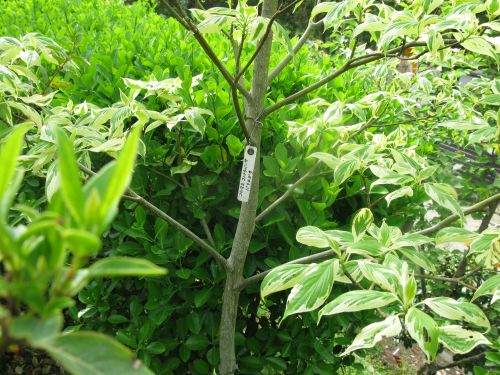 こういう名札の木があったのです美しい斑入りの葉で花ももうじき…こんな形シラタマミズキとも呼ばれるという学名:Cornus alba 別名:シロミノミズキ(白実の水木)科名:フジウツギ科?ミズキ科 Cornusミズキ類コルヌスコントロバーサバリエガータ 「白い妖精とも言われている斑入り葉の水木です。」コルヌスアルバシラタマミズキ‘エレガンティシマ’サンゴミズキというのは サンゴミズキの苗・特選品種Cornus alba 'sibirica'
