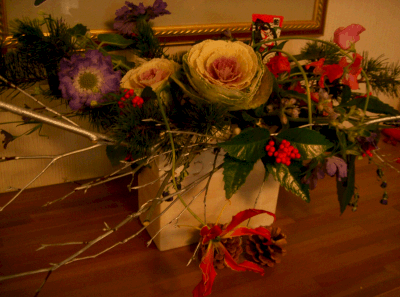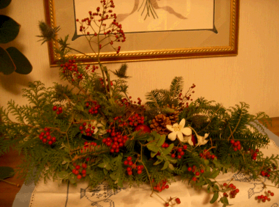 長男期末の真っ最中。あちこちにプリントやら教科書、ノートが散乱していて片付けても片付けてもきりがないので掃除は来週以降ってことでなんかもう『赤点取らなければいい』宣言されちゃって母はあきれるばかりですでも少しは12月の雰囲気を出したいと、今月のアレンジは『クリスマス』でお願いしました普通グリーンはモミの木を使うのですが、モミは1週間くらいで葉がパラパラと落ちてきてしまい掃除が大変ということで、うちの先生はヒノキを使っているそうです。(でもモミも少し使用)うん、主婦にはそのほうが嬉しいかも。。。真ん中はこんな感じ。リンゴは本物で『アルプス乙女』という品種。ちゃんと食べられるそうです。赤い小さな実はサンキライと野バラ。サンキライは長い枝のまま絡めているので、あとで外してリースにも使えます。