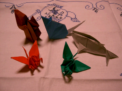 昨夜また少し作りました。今日の行事で低学年にあげるのだそうです。リス、ネズミ、いるか、三つ首の鶴です。リスは私が作りました~少しづつですが上達しています
