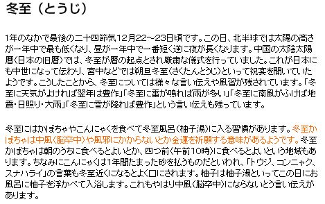 早いもので、もうすぐ 冬至 ですね”冬至”ってそういえば何なのでしょうね~一般的には 1.一年中で昼が一番短く夜が一番長い日2.かぼちゃを食べる日3.ゆず湯に入る日そのくらいでしょうかね~ちょっと調べてみました冬至冬至にもいろいろ言い伝えが言い伝えがあるのですね~皆さんの所にも何か冬至の日に特別なことをされることがありますでしょうか?我が家は お風呂に ゆずを浮かべてゆず湯でしょうか でもみんな出てくる頃にはゆずが ぐしゃぐしゃになっていてお風呂のお湯はゆずの果汁ですっぱい香りが充満していますよ~←ポチットお願いします