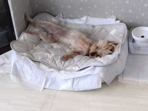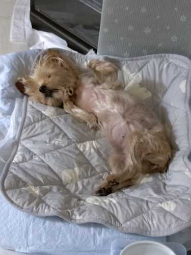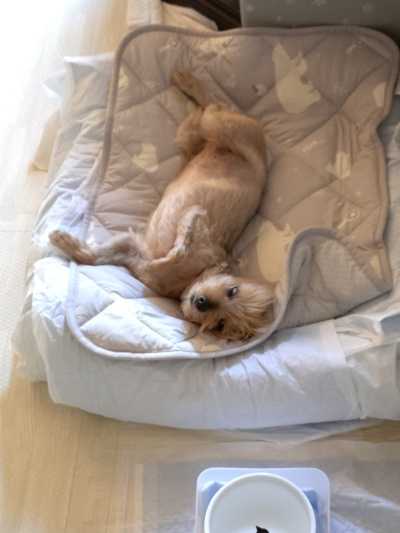 GWが明けた朝。道の向こう側さえ見えないほどの濃い霧が立ち込めていました。朝靄の中のお散歩を終えご飯を済ませたら、お昼まで寝んねです。今では朝の家事が済めば、午前中は通院や買い出しなど私の自由時間です。午前中だけとはいえ、我が家に来た時は5分の外出もできないほど分離不安気味だったのですから、頑張ってくれています。私の昼食の時は、じゅりもちょこっとおやつタイム。その後は和室のお気に入りのカドラーでお昼寝、、、なのですが、この日はこんな場所でそのワケは、最近お昼寝中におねしょすることが増え、カドラーはビニールのクロスで覆ってトイレシートを何枚も敷いて、上の敷物だけ洗えば済むようにしているのですが、じゅりは「やらかした」時は掘りまくることも多いので、水害を防ぎきれないことも。湿度の高い日なのに。。。乾きますように。