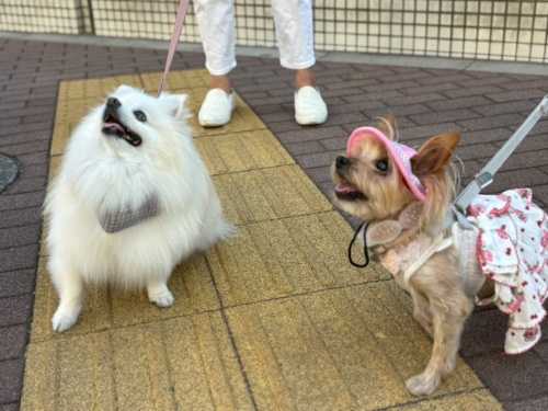 6月とは思えないほど暑かったこの日。お帽子被って、お友達との待ち合わせ場所へ。行ったのは、ワンコ店内OKのヴィーガンカフェです。私自身ヴィーガンは初めて、大きなアイスが乗ったプリンとカフェオレをいただきましたが、植物性のみとは思えない程ちゃんとコクもありつつさっぱりで、美味しかったです。ワンコメニューは可愛いワンコ顔のラテアート(底にサツマイモ入り)と、もちもちのマフィン。どちらもワンズは夢中です。(今日のメンバーは食いしん坊チームだし)人もワンコも大満足なカフェタイムの後は、せっせと歩いてカロリー消費。…のはずが、途中のパン屋さんでひっかかってしまいました。飼い主側も、美味しいスイーツやパンを見逃せません。(摂取カロリーの方が断然多い1日でした)余談:最後の写真は、飼い主が交代でパン屋さんでお買い物中なのですが、 この時は私がパン屋さんの中。 なんとじゅりが中を覗いています。 小さなことかもしれませんが、とても嬉しいです。