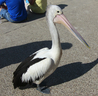 金は浪費せず、5星の満足度!これが、我が家の節約休日のモットーである。先日は、お山(5月23日付けの日記に記述あり。)に出向いたので、今回は海にしよう!!山あり、海ありのゴールドコーストに暮らす醍醐味。ありがたや、ありがたや、今回は、BROADWATER(内海)沿いにある公園の1つHARLEY PARK 別名ペリカン公園へ出発!ここオーストラリアの公園には、いたるところにBBQの施設が整っている。このBBQは、ちゃんとした鉄板もついており、スイッチを押せば電気が入り(当たり前ですが)、我が家にある、ちっちゃなヤツよりはるかに立派な代物である!その上、無料という・・・・・・・ねぇ、節約休日にぴったりでしょ!休日と言わず、毎晩使ったら晩御飯の光熱費がかからなくって$$$$$そのため、人気の公園は休みの日などは、早めに出向いてキープしないと、あぶれた時には、マクドナルドに出向くこととなってしまう。さて、ここの名物。別名ペリカン公園とまで呼ばれるんで、わざわざ説明の必要もないと思うのですが。(・・・・オチも別にないんです。)この公園の向かい側には、シーフードショップとして有名なお店がある。時々、どーーーーーしても、新鮮なお魚がたべたい!と言うときにお世話になるお店であり、(ここオーストラリアのスーパーなどで売っているお魚たちは、刺身などではぜぇーーーったい食べれない代物なので)鮮魚以外にオーストラリア名物フィッシュ&チップス(魚のフライ-ーいろいろな魚があるが、鮫など良く使われる。チップスとは、ポテトチップスのこと)がお持ち帰りでき、昼間などは、お店中がごった返している。そうそう、ここの名物の話。それは、このお魚屋さんから出た、魚の頭や骨をリサイクルしてるんです。お昼前ごろから、内海のラグーン(礁湖)に1羽、2羽、3羽、4,5,6,7,8、・・・・・・・・・・・・・・・・・・・と気づけば、30羽あまりのそうです、やっと名物にたどりつきました、 ペリカン 達 。このペリカンにリサイクルされていたのですね。そして、そのペリカンの餌付けを観にきた観光客(私達)たちが、餌付けが始まるまでの待機してる間に、お店からの香ばしいフィッシュ&チップスの香りに騙されて・・・いやいや、誘われて、鮫の揚げ物を買ってしまうんですねぇ。(ちなみに、鮫のお味は、とっても淡白で、「あーーあーーー、だから揚げるしかないのね」と納得してしまう、そんなお味です。)もちろん、我が家節約休日のモット-。復習しますが、金は浪費せず、5星の満足度!そんな、香りには騙されません。にしても、ペリカン。とっても大きいのですね。ここで見るまで、ペリカンという鳥は、知っていたけどどこで見たかな???くらいの記憶しかない鳥でした。でも、改めて身近でみると、、、、、こんなんです。えっ、あまり大きさが分かりませんか?では、我がムスメをおとりにしてみました。こんなくらいです。で、こちらが、餌付け開始の状態。あまりのペリカンの大きさにお立ち台から、魚をなげるお兄さん。その魚をうけとったペリカンは一旦後方にさがっていき、さてどうするかと思いきや、魚を平らげた後また定位置に戻ってきます。ペリカンたちは、このおっさんを囲む形で餌付けされるのだけど、お魚をもらえるのは、いつも前方にいる鳥ばかり。つまり、お魚にありつけたものが、また次のお魚にありついてる??かといって、後方のペリカンが、デパートのバーゲン会場のおばちゃんたちのように、前方に向って、押し合いへし合いするわけでもなく・・・・なんか、とってもおだやかで心が和んできたのだけれども、バケツのなかの魚が終了した際には、一体魚にありつけなかったペリカンはどんな気持ちで飛び立っていくのか少々気がかりになってしまった。ドコサヘキサンって頭がよくなる筈ではなかったっけ・・・・???どちかっていうと、ムスメより母のほうがテンションの上がってしまった節約休日であった。人気ブログランキングに参加中♪ クリック1票-応援ありがとうございました♪