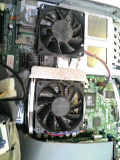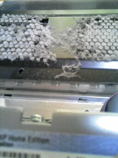 電源部の排気口もホコリが溜まってましたが、CPU&ドライブのクーリングファンが凄い事になっています。マザーボードが見えるくらいまでは分解の必要がありそうです。