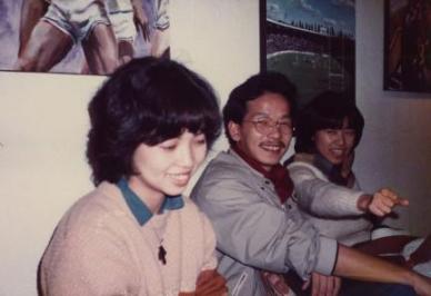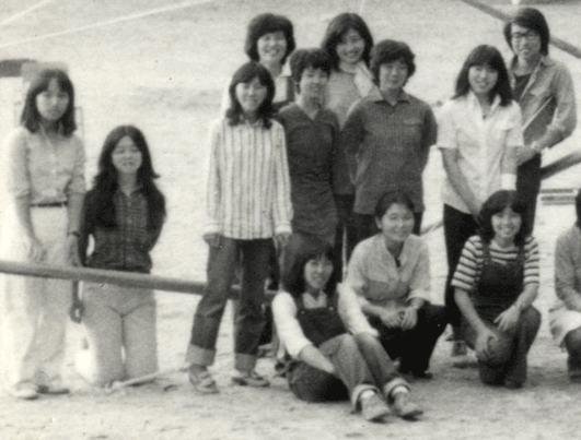 はい、今回最遠参加のデザイン・タラコ還暦晒し!よぉ横浜から来てくれたのぅはい、やつの昔画像!1回生縞シャツにサロペットの子な