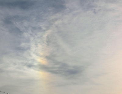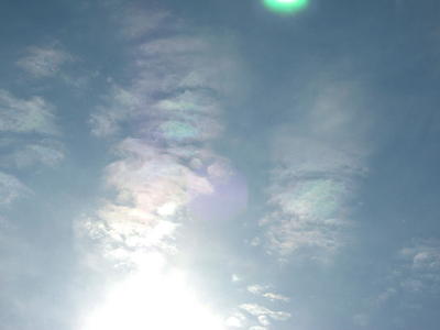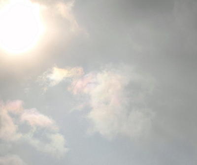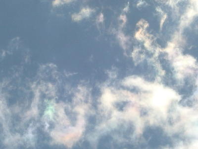 と、言う訳で今日お昼頃に出ていた彩雲です♪…以前は中々気付けなかった彩雲も最近は漸くコツが掴めて来た様でかなり頻繁に見付けられる様になりました(^^ゞ …彩雲と言っても条件によって薄っすら色付く程度のものから、鮮やかな虹色まで…カメラが捉えられるのは勿論後者なので薄めの色の彩雲は中々撮る事が出来ず、今日も見事に没画像の山を築きましたw(^_^;Aそれから今日は久し振りでハロを発見しました♪ ハロは気付いてからあっと言う間に消えたのですが…ところで外側に出ているのは何だろう…σ(^^ゞ