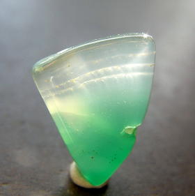 今晩はm(__)mこのところ順調に更新時間が遅れておりますが(^^ゞえー本日の画像はこれ☆ マラカイトタンブルです…これは去年某オークションで落札したものです。この模様に一目惚れっした(*^。^*)…研磨面が歪んで光を反射するのでどーにも巧く再現出来ず、これが3度目の撮影で撮ったモノですが…やっぱりこれも微妙ですなぁ…(^_^;A石を選ぶ時、トリミングの状態や結晶面などにもうひとつの世界を垣間見る事がありますが、これもその基準で選んだものです。手のひらに乗る石の生成時間と産出された場所の距離、さまざまな経緯を経て此処にある不思議…その全てがひとつの奇跡なのだと、石を眺める度に思います。うちにある石もいずれ私の手許から離れる時が来るのでしょうが、この時間は石にとってはほんのひと時の事なのでしょうね。コンゴ産 24mm×23mm×17mm