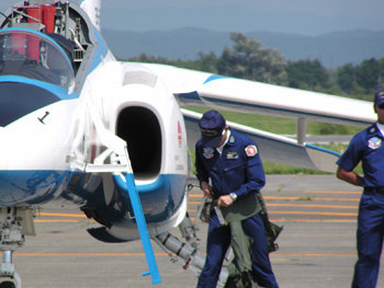 ブルーインパルス・・・パイロットがGスーツ装着して機に乗り込むところです。Gスーツは、血液が下に下がって脳に血が流れなく成るため強制的に下半身を締め付けるもので2G位から機能するみたいです。・・・・人間の限界は9Gと言われております。以前、元パイロットの方の体験談を読んだことが有りますが、7Gで二の腕の毛細血管が切れるのが分かるそうですよ。8-9Gはどんな世界化・・・・・ただただわめく拷問と同じとか・・・意識があれがの話ですが。<今朝の吾妻小富士 雪>