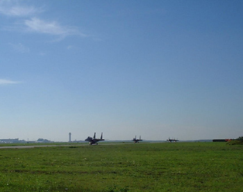 この画像は、F15が着陸して戻って来た所です。<今朝の吾妻小富士 くもり>