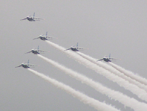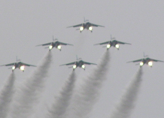 ブルーインパルスの定番でダイヤモンドです。展示飛行で最初に観客に対してのご挨拶ですネ。(ピンボケですいません)きょうは、吾妻小富士は休みです。昨晩は、お得意様の忘年会で温泉宿泊のため・・・(露天からの雪化粧の眺めは最高でした!!飯坂温泉)