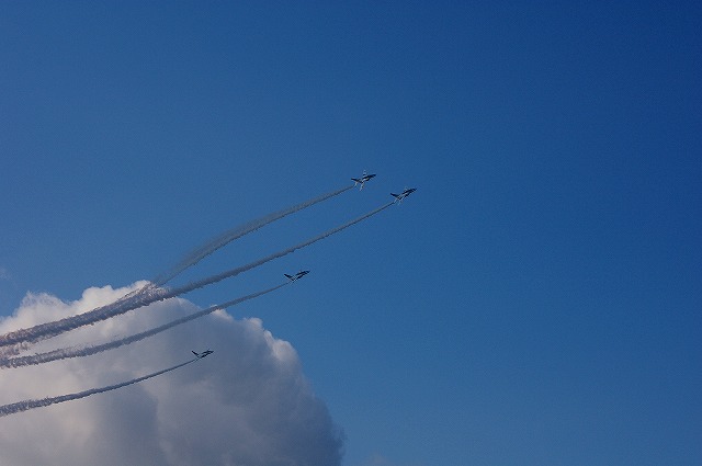 23.02.16松島基地外柵/ ブルー4機が、海上上空で態勢を整え脚を出した状態で、着陸灯を点灯してのローパスです。松島基地外柵/ 外柵から離れた場所なので、幅広く全体を見渡すことが出来てブルーの演技が意外と見やすいかも