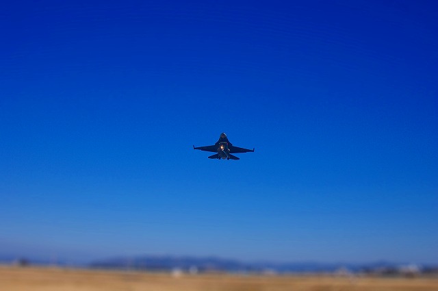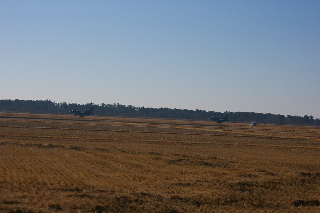 23.02.16松島基地外柵/ このポイントからは、スモーク・チェックは見る事が出来ません。ダイヤモンド・テイクオフは、行われず単発での離陸です。松島基地外柵/ 隊長機に続いて、2番機が離陸して行くところです。松島基地外柵/ そして、3番機が離陸して行きます。松島基地外柵/ そして最後に、4番機が上がってランウェイ中央付近で左旋回を行い3機に追いつくためのシュートカットです。