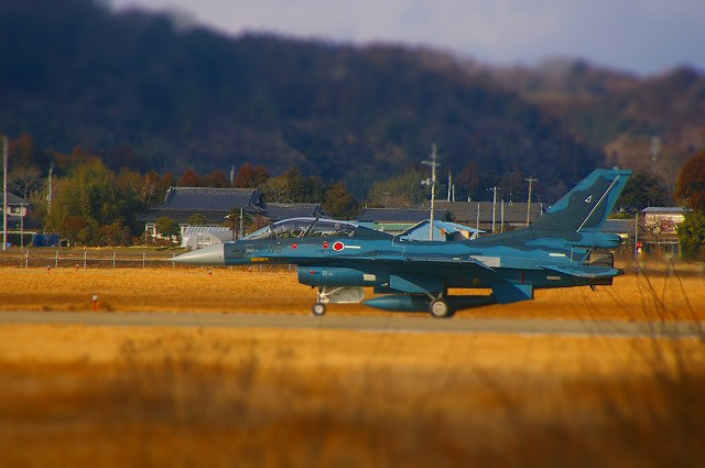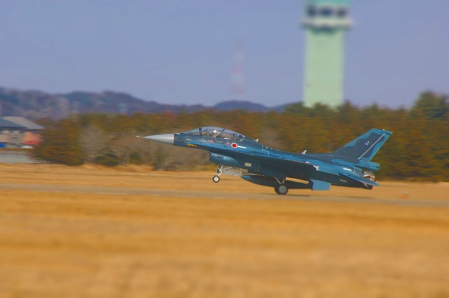 23.01.19松島基地外柵/ F-2 116号機が飛行訓練を終えて帰還したところです。松島基地外柵/ 遠くに、F-2戦闘機の2機が誘導路をタキシングしていきます。
