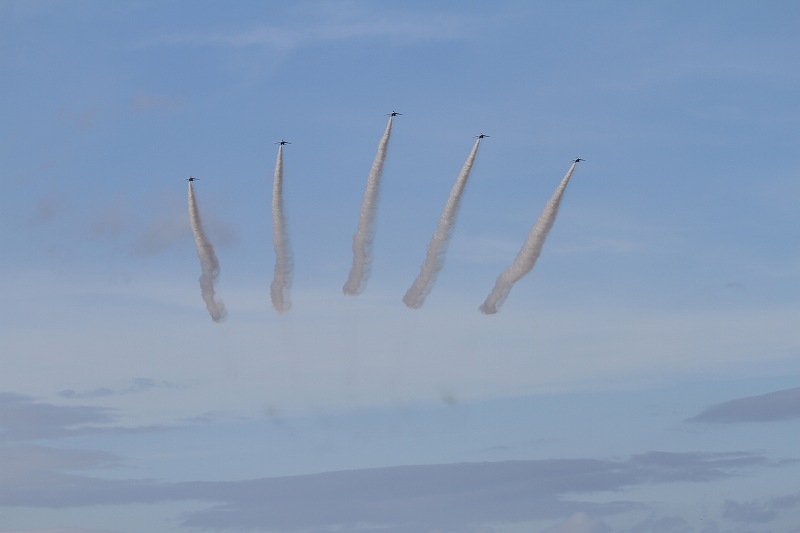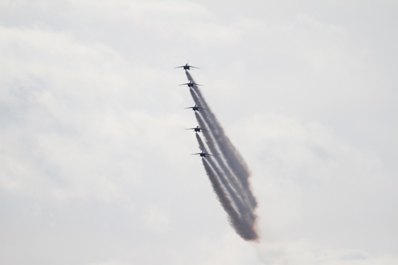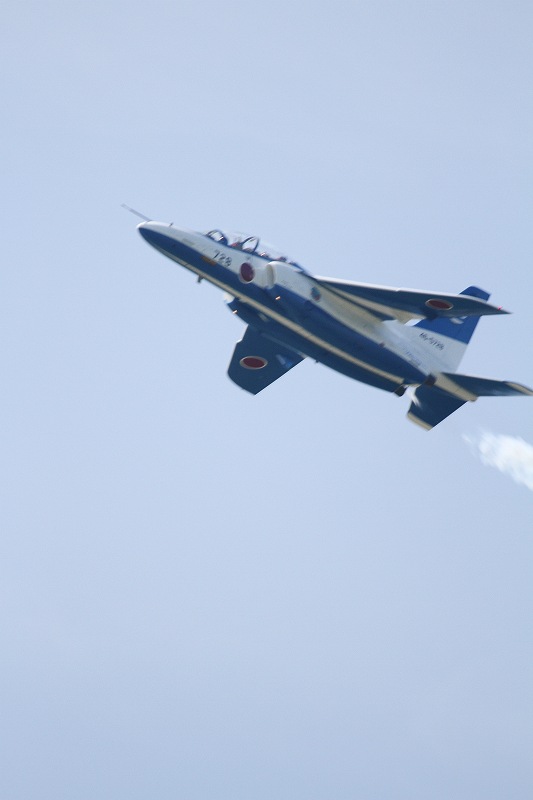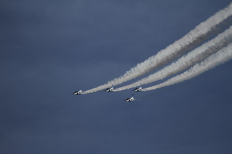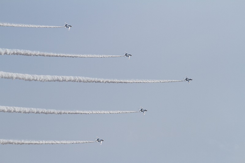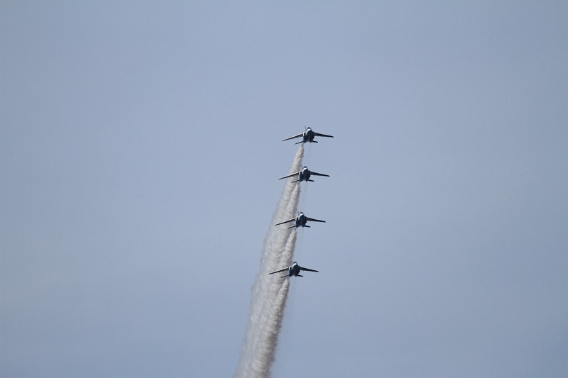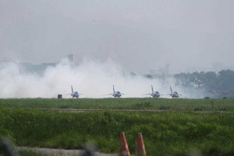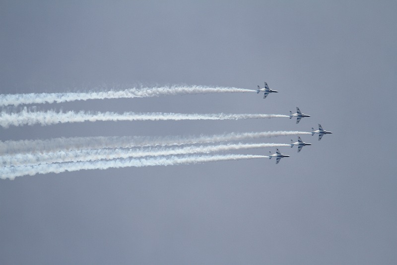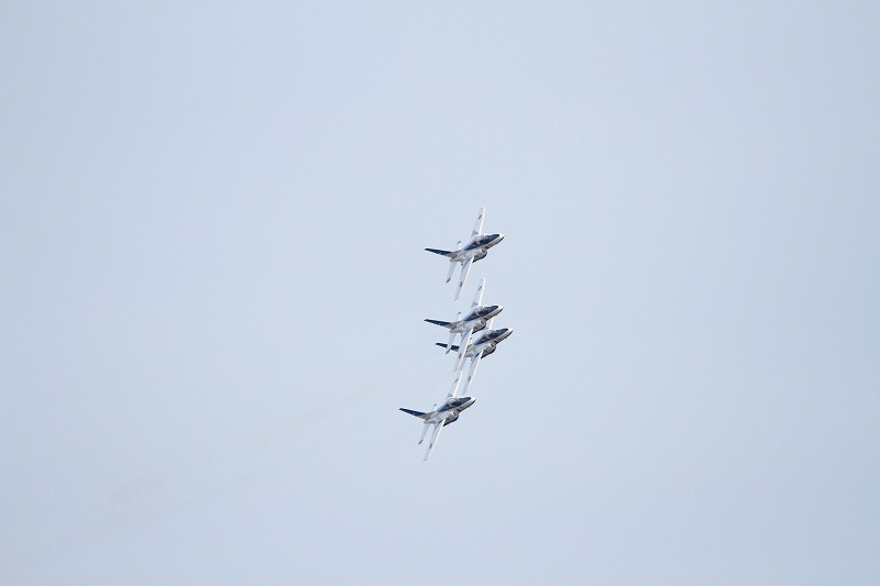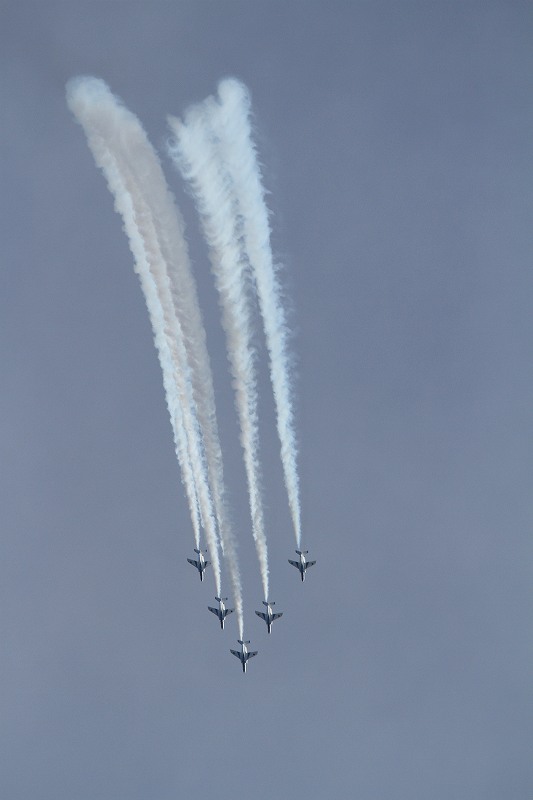 松島基地外柵:28.01.06撮 ブルー5機での飛行訓練です。全ての機に、垂直尾翼ポジション・ナンバーが塗装されていません。6番機、スモーク・チェック。スモーク・チェック。ここを、押して頂くと嬉しいです