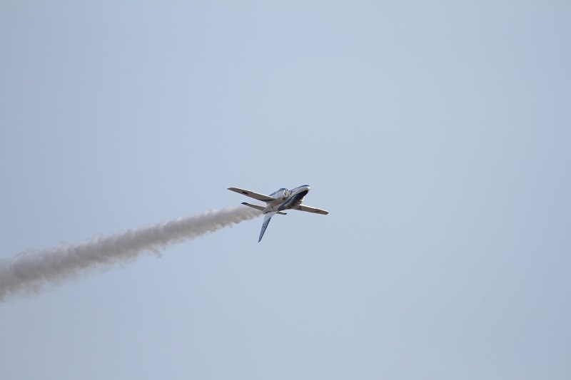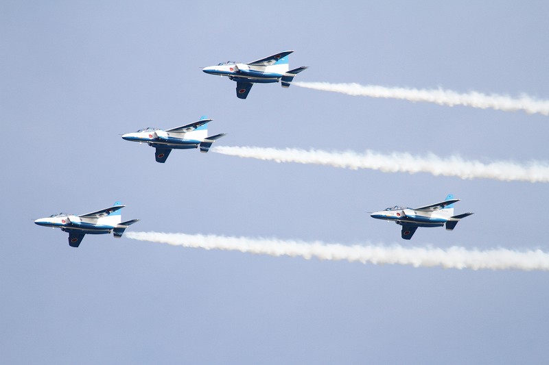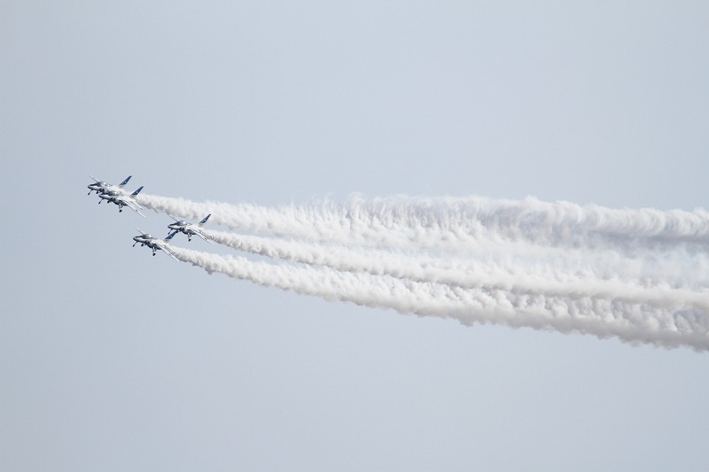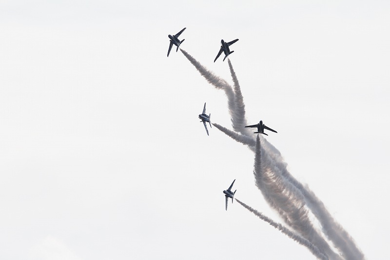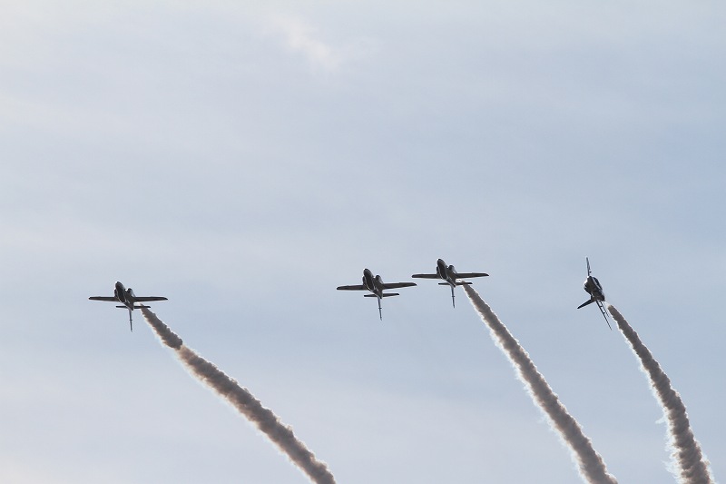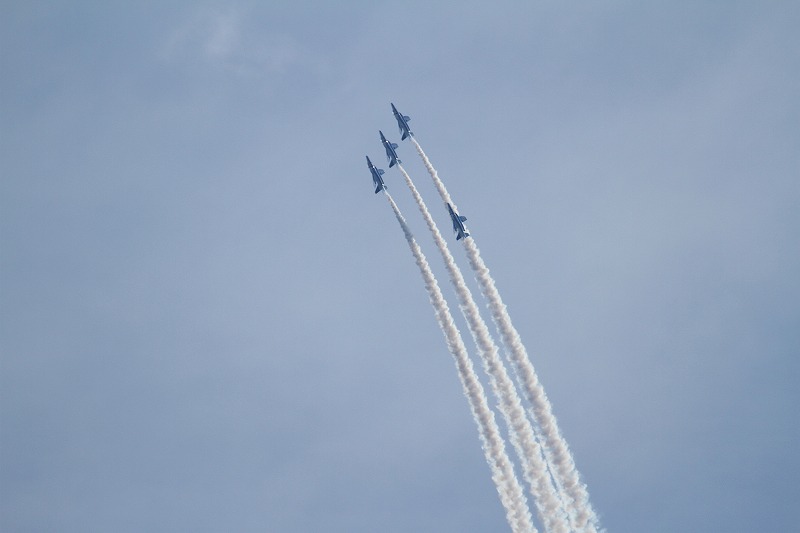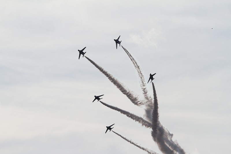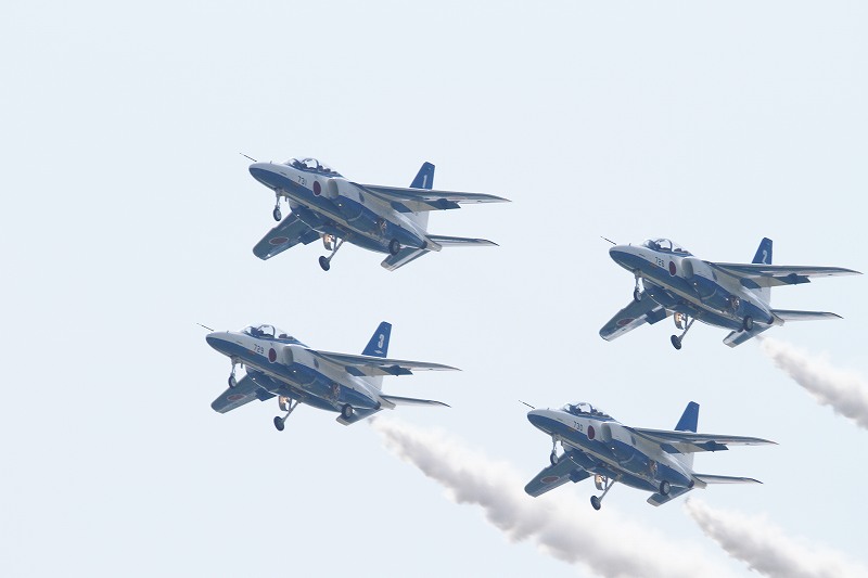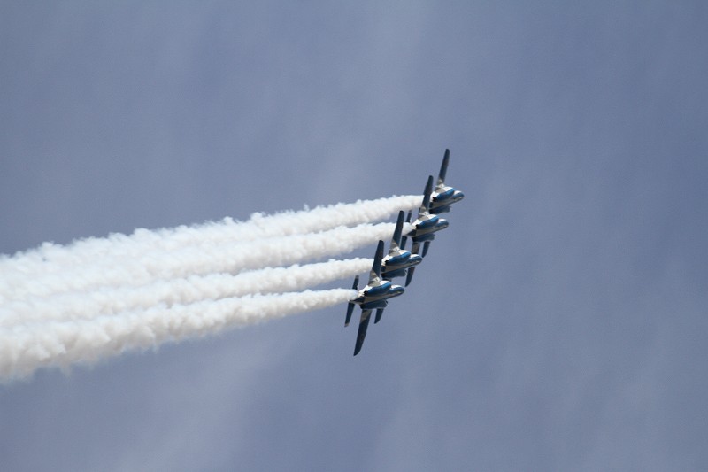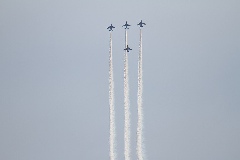 松島基地外柵:28.01.06撮 ブルー5機での飛行訓練です。全ての機に、垂直尾翼ポジション・ナンバーが塗装されていません。6番機、スモーク・チェック。スモーク・チェック。ここを、押して頂くと嬉しいです