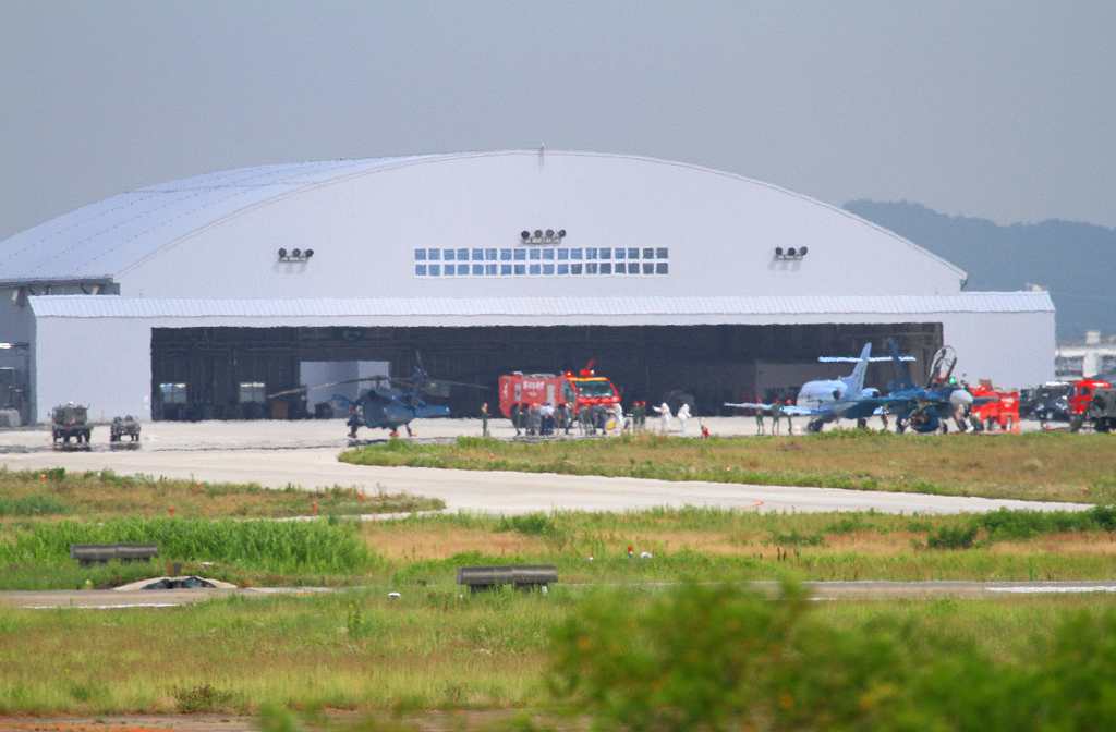 格納庫前に、消防車に多くの隊員さんたち消火訓練でしょうか。