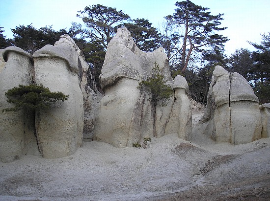陸の松島日本三景のひとつ松島ににているところから「陸の松島」と呼ばれている浄土松公園郡山市逢瀬町多田野字浄土松 あまりにも近くにあり紹介する機会がありませんでした。昨日しばらくぶりに訪れました。まだ訪れる人も少なく静かな公園でした。特に目を引くのは、シンボルの松の緑が近年松くい虫の被害で切り倒され処理された松の木でした。 浄土松公園の「きのこ岩」と呼ばれる奇岩は見事です。長い年月断層によって分断された地層が、それぞれ風化に対する抵抗度が違うため、風浸の度合いが異なり、長い年月を経てキノコ状になりました。と説明がされています。「きのこ岩」と呼ばれる奇岩は一見の価値あります。高さが5~10mもある岩がそそりたつ姿は正に絶景です。 まるでおとぎ話の世界に迷いこんでしまったようです。突然「7人の小人」が出て来そうですよ