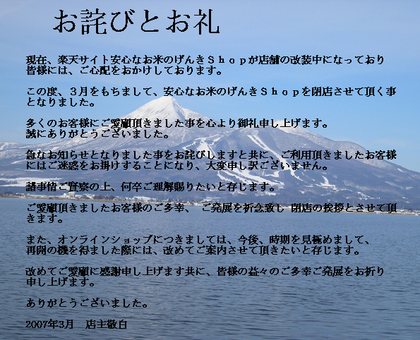 お詫びとお礼 お問い合わせは安心なお米のげんきShopTEL 024-937-1306 FAX 024-937-1307E-mail genki@titan.ocn.ne.jp