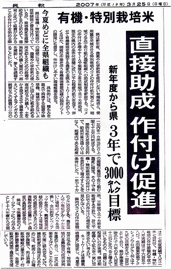 有機・特別栽培米 県は新年度、農薬や科学肥料を使用しない有機栽培と使用量を半減した特別栽培米の作付け拡大策として、地域ぐるみで取り組む農家組織への助成制度を新設します。 有機栽培米とは JAS有機栽農産物の取得 ○ 書類を作成して「有機JAS認定団体」に書類を提出し申請します。 (認定団体にその費用を支払います。) ○ 「認定団体」から検査員が来て、田畑、申請書類等を調査します。 ○ 認定団体が判定委員会を開いてその申請された田畑の有機決定をします。 ○ 「有機米」と認定されれば認定団体から証明書が送付され、「有機米」と表示する事ができます。 ※ ただし、ここで重要な事は「じゃあ有機米と表示してあれば無農薬なのか?」と言う事ですが簡単に言うと「有機イコール無農薬」という訳ではありません。 ※ 「3年間無農薬・無化学肥料で栽培しているが、数少ないが使用しても良い農薬も例外として定められている」と言う事です。 特別栽培米とは 農薬、化学肥料の双方を50%以上減らして栽培された農産物(お米)です。 JAS有機栽農産物のように法的に強制力はありませんが、農業全体が環境保全や安全・安心な農産物作りの重要性を、消費者と共に理解して進んで行く事は大事だと思います。 参照↓ ◆ 有機農産物及び特別栽培農産物に係る表示ガイドライン <福島民報2007.3.25付け>