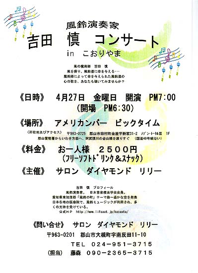 4/27 風鈴コンサートin福島郡山♪ 世界でただ一人のプロの風鈴演奏家吉田慎さんのコンサートが4月27日開催されます。今回は田村市都路村の竹炭工房「都美」の竹炭風鈴も使用しての演奏もありますよ。 ◆ 竹炭風鈴 (汐留の演奏会にて 著作権風鈴演奏家吉田慎さん)ご近所の方はぜひご参加下さい♪日時:2007年04月27日(金)19:00~21:00会場:ビックタイム〒963-0725 福島県郡山市金屋字新家31-2-102 024-956-3955 地図料金:お一人様2500円主催:サロン・ダイヤモンド リリー後援:安心なお米の仲良し倶楽部問い合わせ 024-951-2789Eメール yuki.f@sky.plala.or.jp昨年のコンサートの紹介です。↓風鈴コンサートin 須賀川風鈴コンサートin 郡山風鈴演奏家と竹炭工房「都美」■ 風鈴演奏家さんのHP↓PCにて≫携帯にて≫会場(ビックタイム)の様子