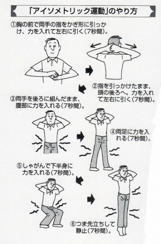 筋肉を鍛えて冷えを克服しよう!part,3筋肉を鍛えて冷えを克服しよう!の続きです。part,2でスクワットを書きましたが、今日はもっと簡単でラフな運動を紹介しましょう。「アイソメトニック運動」と言います。アイソメトニックって、何??「アイソメトリック」とは静的運動と言う意味だそうで、時間も場所も選ばずに専用の道具を揃える必要も無い簡単な筋トレです。アイソメトリックとは、筋肉に力を込めてはいるけど、動かない状態のトレーニングの事です。例えば、壁を押す、タオルを引っ張るなどです。アイソメトリック運動は7秒間で効果を発揮します。7秒間限界の力で動かそうとすると、人間の最大筋力が発揮されて筋トレ成功になるそうです。《アイソメトリック運動のやり方》(1)胸の前で両手の指をかぎ形に引っかけ、力を入れて左右に7秒引き合う。(2)両手の指を引っかけたまま頭の後ろに回し、再び力を入れて左右に7秒引き合う。(3)そのままの体勢で腹部に7秒間力を入れる。(4)次は両足に7秒間力を入れる。(5)しゃがみ、下半身に7秒間力を入れる。(6)つま先立ちをして7秒間静止する。自分の持てる力の60~70%の力でやれば良いのです。アイソメトリック運動は、稼働域が狭い筋肉の為に筋肉痛などは出ませんよ。場所を選びませんし、いつでもどこでも手軽に行えますので、暇な時に思い出してやって見ましょう。腹筋のトレーニングにも非常に有効だそうです。全ての運動に共通していますが、呼吸は、筋トレの基本ですので、くれぐれも息は止めないで下さい。いつでも、どこでも出来る「アイソメトリック運動」習慣にしたい運動です。