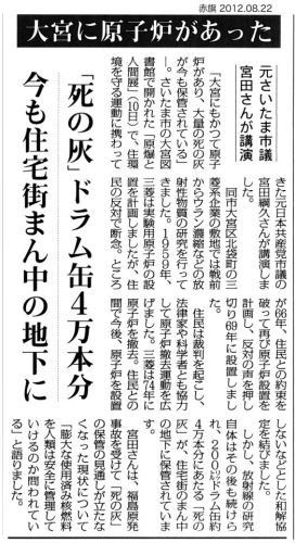 な~んと大宮に原子炉があった!大宮に原子炉があった!のだそうです!そして現在もドラム缶4万本分も住宅街の真ん中の地下にあるというのです。今日は、飯山一郎氏のブログから紹介しましょう!◆ 2012/11/10(土)(2) 過激な爺さんの過激なコメント 大宮・北袋町の住宅地の真ん中にある三菱系企業の敷地には、ドラム缶4万本もの核廃棄物が保管されている。 この企業は、住民との約束を破り、原子炉まで設置していたという。ここでは戦前から「核」の研究開発をしていた。 そこで鷲は、次のようなコメントをフェースブックに書き込んだ。 戦前、「大日本帝国」の核(原爆)の研究開発レベルは世界の最先端でした。 湯川秀樹が「原爆製造の極秘情報」を米国に漏洩したので、米国が一歩早く原爆を完成した…。この論功行賞が突然のノーベル賞だった。…という「説」もあるほどです。 大宮・北袋町の核廃棄物も、戦前の日本が核開発に躍起となっていた「ツワモノどもが夢の跡」なのでしょう。 これが↑なんか凄い反響なのでR。 上の文章中の「湯川秀樹ノーベル賞」のウラ話が。 鷲は常々、「権威」など有り難がるな! と言ってる“反権威主義者”なのでR。 ノーベル賞なども↓ くだらん! と書いている。大宮・北袋町に大量の核廃棄物。4万本の内訳/ 概況を伝えるHP三菱原子力工業(株)大宮研究所資料各地の非発電原子炉 そう言えば福島県石川町で戦時中「原子爆弾開発の為のウラン採掘がされていた!」という話がありました。ウィキペディアで検索して見るとありました。以下、ウィキペディアより抜粋↓第二次世界大戦(太平洋戦争)中、軍部には二つの原子爆弾開発計画が存在していた。大日本帝国陸軍の「ニ号研究」(仁科の頭文字より)と大日本帝国海軍のF研究(核分裂を意味するFissionの頭文字より)である。1944年12月に日本陸軍は福島県石川郡石川町でのウラン採掘を決定した。1945年には飯盛里安が率いる実験施設の理研希元素工業扶桑第806工場を開設し、4月から終戦まで旧制私立石川中学校の生徒を勤労動員して採掘させた。 しかし、そこで採掘される閃ウラン鉱・燐灰ウラン石・サマルスキー石等は、ごく少量であり、ウラン含有率も少ないものであった。1945年5月15日のアメリカ軍による東京大空襲で熱拡散塔が焼失したため、研究は実質的に続行不可能となった。その後、地方都市(山形、金沢、大阪)での再構築をはじめたが、同6月に陸軍が研究を打ち切り、7月には海軍も研究を打ち切り、ここに日本の原子爆弾開発は潰えた。ニ号研究・F研究には当時の日本の原子物理学者がほぼ総動員され、その中には戦後ノーベル賞を受賞した湯川秀樹(F研究)も含まれていた。関係者の中からは、戦後に湯川を始め被爆国の科学者として核兵器廃絶運動に深く携わる者も現れるが、戦争中に原爆開発に関わったことに対する釈明は行われなかった。※ この記事に対して、次回に書いて見ます。