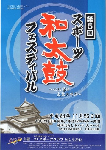 「スポーツ和太鼓フェスティバル」昨日、白河市のJAしらかわセレモニーホールで「第5回スポーツ和太鼓フェスティバル」が開かれました。この「和太鼓フェスティバル」は今年で5回目を迎えたそうで、震災復興と被災者、避難者を元気づける事を目的に開催されました。今年のテーマ『~心に響け、太鼓の叫び』と題し、県内外の団体が9団体出演しました。東京からは、太鼓集団天邪鬼と和-Jinの両プロ団体が特別出演しました。【出演団体】1、奥州白河太鼓(白河市)2、帝京安積高等学校和太鼓部(郡山市)3、岩代國郡山うねめ太鼓保存会ゆき組(郡山市)4、和紙の里 和雅美太鼓(安達町)5、奥州須賀川太鼓松明太鼓保存会(須賀川市)6、標葉せんだん太鼓保存会(双葉町)7、和-Jin(東京都) 【特別出演】8、太鼓集団天邪鬼(東京都) 【特別出演】9、愛宕陣太鼓連響風組(福島市) オープニングは、以前紹介しました夜ノ森の人力車の遠藤 良一さんです。1、奥州白河太鼓(白河市)2、帝京安積高等学校和太鼓部(郡山市)紹介にあるように「帝京安積の太鼓はすごい!」とても心に響く太鼓でした。益々のご活躍を期待します。3、岩代國郡山うねめ太鼓保存会ゆき組(郡山市)うねめ太鼓保存会を卒団した会員で構成されています。うねめ伝説のはぎ姫の創作太鼓は素晴らしい!!4、和紙の里 和雅美太鼓(安達町)素敵な衣装以上に素晴らしい太鼓でした。5、奥州須賀川太鼓松明太鼓保存会(須賀川市)6、標葉せんだん太鼓保存会(双葉町)先の見えない避難生活、双葉の伝統芸能を失くしたくない!そんな思いで続けていきます。7、和-Jin(東京都) 【特別出演】8、太鼓集団天邪鬼(東京都) 【特別出演】【特別出演】和-Jin(東京都)プロパフォーマンスグループ 和-Jin男性4人と女性の5人グループです。ライブは楽しくなければならない!理屈はいらない!と観客と一緒になるライブを目指し、海外ツアーも行っています。今回は、双葉町の標葉せんだん太鼓保存会のご縁で出演が実現したそうです。太鼓集団天邪鬼(東京都)伝統芸能の和太鼓に現代的要素を取り入れ、新たな和太鼓音楽の確立を目指すプロ集団です。天邪鬼の代表者である渡辺洋一氏は、和太鼓指導の第一人者です。 ◆ 「スポーツ和太鼓フェスティバル」※ 今回のスナップは観覧席から撮影した為にピンボケしています。申し訳ごさいません。