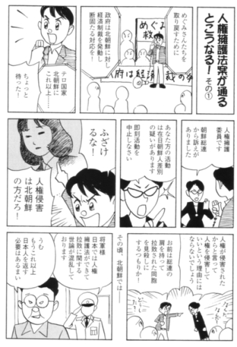 人権委員会設置法案とは?人権委員会設置法案???一般には、あまり知られないでいますが?ネット界では、この法案の怖さが語られています。ふじふじのフイルターさんは以前から、「人権委員会設置法案」は言論の統制であり、戦時中に逆戻りする法案でありすごく恐ろしいものであると情報を発信しています。2012年11月 6日 (火)付けの記事からです。↓◆ 「人権委員会設置法案」が可決したらと思うと、すごく恐ろしいです。田中慶秋法相が、暴力団関係者との関係を暴露され辞任し、後継に前法相滝実氏が就任しました。しかしこの辞任劇には「人権救済法案」成立を最優先する為だったのだそうです。以下、文殊菩薩ブログ版より「人権救済法案」に付いてマンガで紹介していますので掲載させて頂きます。滝実法相が「人権救済法案」成立を最優先課題とする旨を明言 (2)まんが 「人権用語法案」が通るとこうなる!こんな悪法を成立させる事は許せません!