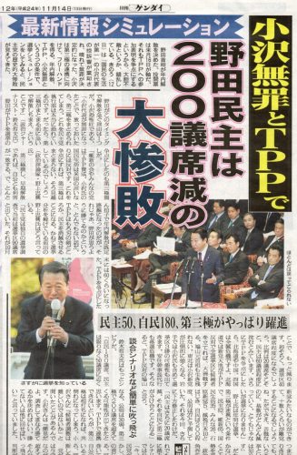 明日衆議院解散に!民主党は、16日に衆議院を解散する事を決定した。14日野田首相は、自ら求めた党首討論の場にて、16日衆議院解散を決定した。「近いうち解散」を8月上旬に約束したものの、様々な口実を設けて延命を図ってきた首相も、遂に退路を絶つほかなかったようである。先日に野田首相は今回の総選挙に「TPP」を争点にした。TPP賛成のマスコミが世論を誘導して「TPP選挙」なら負ける事はないとでも思っているのか?なんともおめでたい方である。自民党の小泉元総理が「郵政選挙」で大勝した夢をもう一度!とも思っているのだろうか?先日、環太平洋経済連携協定(TPP)に対してJA は「TPP」は、我々の死活問題である!賛成の党は国政選挙では推さないと『踏み絵』であると表明しているのです。※ JA、各党にTPP「踏み絵」 代表招き賛否表明追及へ TPPに対して民主、自民、公明、維新は賛成の立場であります。長年保守的であった農民達が目覚める時が来たのです。今回の選挙は、普通の国民の生活が、これ以上貧しくならないような政治に!「国民の生活を第一に考える政治」になってほしいものです。震災の復興と徹底した放射能対策を最優先にしてほしいものです。各紙は、野田民主は200議席減の大惨敗!民主50、自民180、第三極がやっぱり躍進と報道しています。文殊菩薩ブログ版が的を得ていますので掲載させて頂きます。最新情報シミュレーション 小沢無罪とTPPで野田民主は200議席減の大惨敗民主50、自民180、第三極がやっぱり躍進野田がこのタイミングで解散を急ぐ理由は1つだ。放っておいたら、第三極をまとめられてしまう小沢恐怖症である。Gendai.Net 2012年11月14日 掲載<談合シナリオなど簡単に吹っ飛ぶ> 野田首相が年内解散を決めた。投開票は来月16日が軸だ。それもTPPへの参加表明を争点にするというから、大胆不敵というか、錯乱している。12日は「国民の生活が第一」の小沢代表の控訴審が棄却され、晴れて無罪が決定的になった。小沢は第三極の連携に向けて、フリーハンドを得る。年内解散、TPP、小沢無罪という3つの条件で、選挙シミュレーションをしてみると、民主党の歴史的大惨敗が見えてきた。 野田がこのタイミングで解散を急ぐ理由は1つだ。小沢恐怖症である。続きを読む 追伸森光子さん死去の訃報が載ってます。92歳でした。生涯現役女優「森光子さん」ご冥福をお祈り致します。