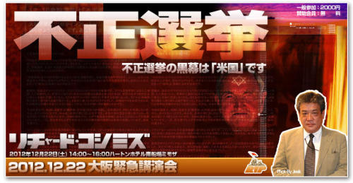 おきむくり?「おきむくり」ってわかりますか?福島や栃木などの方言で、朝起きてすぐとか起きたばっかりの意味です。使い方は「おれ、おきむくりに散歩にいくだ!」私は、起きてすぐに散歩に出かけます。と言う意味です。先日知人と話していた時にでた言葉です。「おきむくりにかってに行ってこい!」と言われたそうです。その方は同じ福島なのにチンプンカンプンだったそうです。おきむくりは朝起きてすぐです。かってとは本家である。「おきむくりにかってに行ってこい!」は、朝起きてすぐ本家に行って来なさいと言う意味だったのです。なんとも複雑な方言ですよね。「おきむくれ」にPCを立ち上げたらリチャード・コシミズ氏の記事が飛び込んで来た!「不正選挙」!今回の12,16の「不正選挙」についてリチャード・コシミズ氏が2012.12.22 「大阪緊急講演会」を開催しました。リチャード・コシミズ氏は今回の総選挙は1億総国民が覚醒(かくせい)するきっかけになったと指摘しています。国民が覚醒したのは、オーム事件であり、9,11、3,11でした。しかし今回の総選挙は3,11の100倍もの国民が覚醒したのです。今回の総選挙には、統一教会、創価学会、幸福の科学のカルト信者が多く関わっていたのです。リチャード・コシミズ氏は小沢一郎氏は、国民1億総覚醒するように仕組んだのだと指摘します。投票率は、過去最高だった。1,000満票が盗まれたのです。今回の選挙で正しく未来の党に付けられていたら全員当選していたはずである!ほとんどの方は、未来の党に投票していたのだから!後進国じゃあるまいし、日本でそんなことが起こるはずがない!日本人がそんなことをするはずがない!と思ってますが現実に日本で起こっているのです。「不正選挙」自民は50議席、維新も15議席くらいしかなかったはずである!インチキな選挙で選ばれた「第2次安部内閣」が昨日発足しました。ぜひ、リチャード・コシミズ大阪緊急講演会の動画を見て下さい。そして覚醒して下さい!リチャード・コシミズ大阪緊急講演会↓◆ リチャード・コシミズのブログhttp://www.youtube.com/watch?v=6O6VURyV_ug&feature=share&list=PLPg7hSdi4rU4TWy74LlOr5BF31YOPvdy4連続再生URL(9分割)https://www.youtube.com/watch?v=6O6VURyV_ug&list=PLPg7hSdi4rU4TWy74LlOr5BF31YOPvdy4万ちゃん、ご苦労様。なお、ご視聴になる前に以下の文書をご一読ください。不正選挙追求の手法リチャード・コシミズでした。