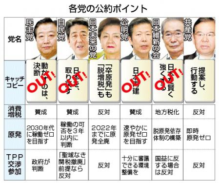 日本の命運を決める!日本の命運を決める総選挙が公示されました!原発を止めるか!推進するのか?消費税を撤回させるか!増税を推進するのか?TPPを止めるか!TPPを推進するのか?か選択の選挙です。12の党が乱立しているが、実は二極構造なのです。原発・消費税増税・TPP推進 対原発・消費税増税・TPP反対 なのです。ところが、メディアは、原発・消費税増税・TPP反対の「日本未来の党」を中心とする勢力の報道をしません。先日新党「今はひとり」を立ち上げた山本太郎氏が語っていましたが、日本の70%の国民が既存の新聞、TV雑誌からしか情報を得ていないのです。ですから、マスメディアが情報の操作をしているのです。その山本太郎氏がツイッターで橋下氏に「挑戦状」で「ガチンコ勝負しませんか」と呼びかけましたが受け入れられず維新の代表の長男 石原伸晃氏(自民党前幹事長)の選挙区、衆院東京8区から立候補する意向を示した。これは、面白い選挙区になりそうです。この選挙区では前回不正操作が行われ、石原伸晃氏が当選したと言う情報があります。維新の会では、石原慎太郎氏の息子が立候補している2選挙区には、候補者を出していません。「日本未来の党」が政権公約!1、10年以内の原発ゼロ・原発再稼働阻止2、消費税増税の凍結3、TPP交渉不参加さらに、天下り全面禁止政府関係法人の廃止国の地方分支局の地方の広域連合への移譲中学卒業までの子どもに年間31万2千円の手当支給税を財源とする「最低保障年金」と「所得比例年金」の構築による年金制度一元化である。今日、各党の党首。代表が福島県で第一声を上げる!民主党のの野田佳彦首相が福島県いわき市で自民党の安倍晋三総裁は福島市で未来の党の嘉田(かだ)由紀子代表は、飯舘村で遊説を開始。社民党の福島瑞穂党首は会津若松市で第一声を上げる!未来の党の嘉田由紀子代表が郡山駅前で「日本未来の党」の候補者の応援かけつけます。応援に行きます!!画像 飯山一郎氏