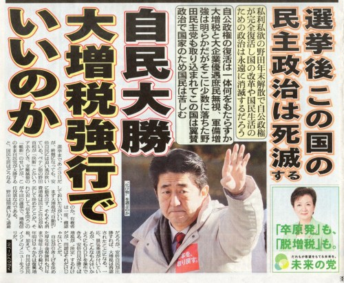 本当にこのままでいいのですか?自民党が大勝すれば!自公民+維新の「大政翼賛会」が成立すれば!この国の民主主義は崩壊する!大増税が強行されます!全国の原発が再稼働されます!日本に、海外の農産物がなだれ込みます!お金持ちしか診療が受けられなくなります!フクシマと同じ事故が起これば日本は崩壊します!国防軍で徴兵制までもくろむ!本当にこのままでいいのですか?3年前に「国民の生活の為の政治」を訴えた民主党に政権を預けた。しかし、わずか8か月で見事に国民の期待は裏切られ「国民の生活の為の政治」は崩壊した。国民に約束した「国民の生活の為の政治」を再び実現しようと小沢一郎氏を中心とした仲間が立ち上がり『卒原発』を掲げる滋賀県知事嘉田由紀子氏とが「日本未来の党」を結党したのだ!「脱原発」「消費税凍結」「TPP反対」の大道で一致した党の躍進しか自公民+維新の「大政翼賛会」勢力を止める方法はありません。「日本未来の党」「社民党」「新党大地」「新党日本」「共産党」(?)しかありません。以下、日刊ゲンダイから掲載します。選挙後 この国の民主主義は死滅する自民大勝 大増税強行でいいのかあっという間に全国の原発が動きだす恐怖日刊ゲンダイ 2024/12/13 発行 私利私欲の野田年末解散で自公政権が完全復活し国の改革や国民生活のための政治は永遠に消滅するだろう自公政権の復活は一体何をもたらすか大増税と大企業優遇庶民無視、軍備増強は明らかだがそこに少数に落ちた野田民主党も取り込まれてこの国は翼賛政治で国家のため国民は苦しむ 選挙まであと3日だが、終盤になっても、安倍自民には追い風が吹いている。ペテン師の野田首相が「決断」とかいうアホらしさ、支離滅裂の「維新」のせいだが、このまま自民党が大勝すると、国民生活はどうなるのか。 有権者は一度、認識しておいた方がいい。続きを読む