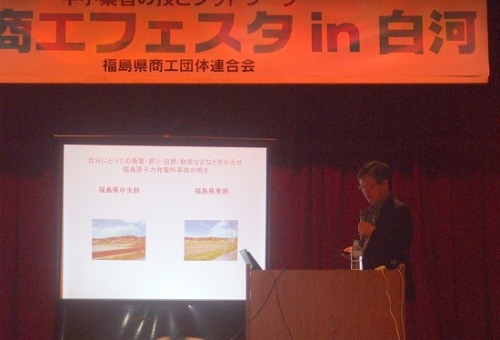 商工フェスタinしらかわ昨日、ご縁で「第3回福商連フェスタinしらかわ」に【みさちゃんの絵筆】で出店しました。 会場は先日「スポーツ和太鼓フェスティバル」で紹介しました、JAしらかわセレモニーホールでした。09年11月郡山市で開かれた「商工交流会」に新鮮美感さんのご縁で参加しました。その「商工交流会」は2回目だったそうで昨年は大震災で中止になり今回が3回目の開催だそうです。私共は会員ではないのですが、知人の紹介で出店させて頂きました。2,009年11月の記事です。↓◆ 知恵と技術で挑戦!商工交流会◆ 女王鉢って?今回の基調講演は、名城大学経済学部 井内尚樹教授で、「原発ゼロと自然エネルギーによる循環型地域経済の構築」というテーマ―で話されました。東日本大医震災と東電福島第一原発事故後、日本の経済は危機に見舞われています。地域経済の再生=原発ゼロ社会を目指す。原発に頼らないドイツのフライブルクの街づくりの様子などを紹介し、いかにして原発に頼らず自然エネルギーなどの普及や財源の確保(市民ファンド)などの活用法を紹介した下さいました。地域資源の活用で林業では木質チップやペレットでのエネルギーとして使うい、河川では段差を利用した発電を行い、畜産の問題になっている家畜の糞尿から発生するメタンガスを利用して、エネルギーに転換できるそうです。それも全て大企業主導でなく地元の中小企業が中心になって行われているのだそうです。今回の総選挙でも脱原発が最大のテーマです。原発をゼロにした後の社会の在り方の参考になりました。とても貴重な提案を感謝致します。※ シンポジューム↓会場今回の商工フェスタには40のお店が出店しました。 ロシアンカフェ TEREMOK(テレモック)の看板娘さんとお友達になってしまいました。ミラちゃんとえりかちゃんです♪TEREMOK(テレモック)はウクライナのご出身のチェルノバさんとご主人の藤澤さんが作るピロシキが有名なのだそうです。ピロシキはロシアやウクライナ、ベラルーシなどで食べられている伝統料理です。機械などでは作れず、1個1個手作りで作り、大変、時間と手間がかかるそうで、週末などお母さん達が時間がある時や特別な日に出されるごちそうなのだそうです。 マメ情報員 【県南・いわき担当】 郡山在住、自然とロックを愛する27歳です。さんの記事です。◆ ピロシキが食べられるカフェ(西郷村)今度はお店にお邪魔させて頂きます。お店は↓ Cafe&Shop テレモック住所】福島県西白河郡西郷村大字小田倉字後原82TEL/FAX:0248-25-3363Eメール:imex.7@kcf.biglobe.ne.jp