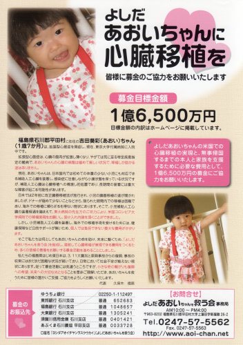よしだあおいちゃんを救う会吉田葵彩(よしだあおい)ちゃんを救う会のチラシは2日に頂いたのですが、選挙の記事が多かったので今日になってしまいました。以下、「よしだあおいちゃんを救う会」の記事から掲載させて頂きます。よしだあおいちゃん(1歳7か月)は東日本大震災後福島県石川郡平田村に産まれました。あおいちゃんは拡張型心筋症で心臓の筋肉が拡張し薄くなり、やがては死に至る病気だそうです。あおいちゃんの心臓病は極めて難しく移植しか助かる道はないそうです。現在は東京大学付属病院に入院中です。「よしだあおいちゃんを救う会」のHPであおいちゃんの近況報告が掲載されています。東大病院の先生方のご尽力により、米国コロンビア大学病院で移植手術を行う事になりました。海外での移植手術を受ける為には、莫大な費用がかかります。そこで、「よしだあおいちゃんを救う会」を結成して心臓移植実現できる費用を作る為に、多くの方々の善意をお願いする事になりました。あおいちゃんを救う為に皆さんの温かいご支援、ご協力をお願いします。「よしだあおいちゃんを救う会」代表 久保木 徳男【お問い合わせ】よしだあおいちゃんを救う会事務局 〒963-8202 福島県石川郡平田村上蓬田字新屋敷26-2TEL : 0247-57-5562 FAX : 0247-57-5563「よしだあおいちゃんを救う会」HP◆ 募金のお振込先ゆうちょ銀行 02250-1-112497□ 「ヨシダアオイチャンヲスクウカイ」(よしだあおいちゃんを救う会)
