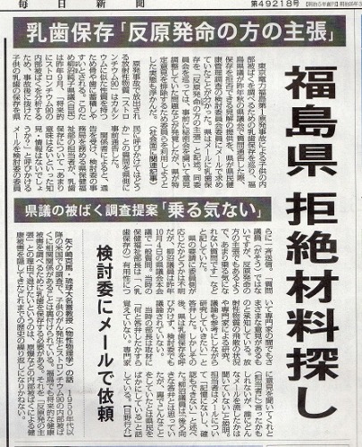 福島県が乳歯保存拒絶!?福島県が県民健康管理調査の検討委員会委員に事前に秘密会を開催し、意見のすり合わせをしていた事実が明らかになった、福島県でまた、<福島被ばく調査>で 検討委に事前にメールで依頼していた事がわかった。以前から山下俊一福島医大副学長を筆頭に御用学者、山下俊一福島県立医大副学長が中心になった「秘密会」で「原発事故とは因果関係がない!」とシナリオまで出来上がっていましたが、今回は県議会で子供の乳歯保存する事で内部被ばくの分析の為にしようと提案したが、反原発命の方の主張であり「あまり意味はない」と事前に関係者にメールを流したのです。県側としては、何と答弁したかすら覚えていないと返答したそうです。以前からであるが、福島県側のあきれた対応である! ※ 【福島県 県民健康管理調査関係の記事】◆ やはり存在してました「秘密会」が!◆ 福島県の健康調査続報! ◆ 山下俊一福島医大副学長のおふれ!以下、毎日新聞 から掲載します。<福島被ばく調査>乳歯保存拒絶の材料探し 検討委に依頼毎日新聞 12月19日(水)2時32分配信 東京電力福島第1原発事故による子供の内部被ばくを調べるための乳歯保存を巡り、福島県議が昨年秋の県議会で質問通告した際、保存を拒否できる見解の提供を、県が県民健康管理調査の検討委員会委員にメールで求めていたことが分かった。県はメールに乳歯保存を「反原発命(いのち)の方の主張」と記述。同委員会を巡っては、事前に秘密会を開いて意見調整していた問題などが発覚したが、県が特定意見を排除するため委員らを利用しようとした実態も浮かんだ。 原発事故で放出される放射性物質「ストロンチウム90」はカルシウムに似た性質を持つため骨や歯に蓄積しやすいとされる。このため柳沼(やぎぬま)純子県議(自民)は昨年9月、「将来的にストロンチウム90の内部被ばくを分析するため、事故後に抜けた子供の乳歯の保存を県民に呼びかけてはどうか」との質問を県側に事前通告した。 関係者によると、通告を受け、検討委の事務局を務める県保健福祉部の担当者が、乳歯保存について「あまり意味はないといった知見・情報はないでしょうか?」と呼びかけるメールを検討委の委員らに一斉送信。「質問議員(がそう)ではないですが、反原発命の方の主張でもあるようで、あまり乗る気になれない質問です」などと記していた。 県の要請に委員側が応じたかどうかは不明だが、柳沼議員は昨年10月4日の県議会本会議で一般質問。当時の保健福祉部長は「(乳歯保存の)有用性について専門家の間でもさまざまな意見があるものと承知している。放射性物質の飛散の状況や専門家による研究、議論も参考にしながら研究していきたい」と答弁した。しかしその後、県は乳歯保存を呼びかけず、検討委でも議論されていない。 当時の部長は取材に「何と答弁したかすら覚えていない。専門家に意見を聞いてくれと(担当者に)言ったかもしれないが、誰にどんなメールを流したかは聞いていない」と説明。担当者はメールについて「記憶にないし、確認もできない」と述べた。柳沼議員は「後ろ向きな答弁とは思っていたが、裏でこんなことをしていたとは県民をばかにしている」と話している。【日野行介】 ◇ 担当者が送ったメール全文 「県民健康管理調査」 検討委員会 各委員様 健康管理調査室 ○○○○(※原文は実名) 明日から開会の9月議会の質問で、自民党柳沼純子議員から「将来的な、ストロンチウム90の内部被ばく分析のため、乳歯の保存を県民に呼びかけてはどうか?」という内容があがってきています。 このままだと、「専門家の意見も聞きながら検討してまいりたい。」といった答弁になりそうですが、現在の状況を踏まえると、あまり意味はないといった知見・情報はないでしょうか? 質問議員ではないですが、反原発命の方の主張でもあるようで、あまり乗る気になれない質問です。 情報があれば、至急お願いいたします。 ≪毎日新聞2012.12.19付け≫