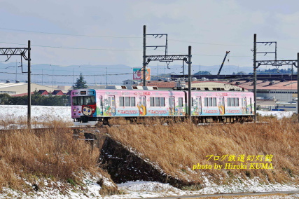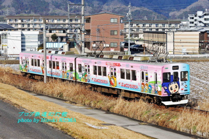 狸のやきものが居並ぶ信楽の街なかを抜けて伊賀をめざします。伊賀上野といえば、松尾芭蕉の生まれ故郷として有名であります。伊賀上野の城跡は公園として整備されていますが、その一角には芭蕉の生誕300年を記念して建てられた俳聖殿という建物もあります。妻が同行しているため、今回はそうした市内観光もセットなのでありますが、その前にちょっとだけおテツを。信楽から山越えをして伊賀へ行ったため、最初に着いたのはJR関西本線の伊賀上野駅。関西本線といえば、加太越えを思いだしますが、残念ながらわたくし、国鉄時代の加太越えを目にすることはできませんでした。今は駅前も閑散としており、D51が爆煙をあげて走り回っていたことなど、想像もできません。伊賀鉄道は初めての訪問でありますから、どこにポイントがあるのかよく分からないのですが、駅前に設けられていた観光案内看板で近くに鉄橋があることが分かりましたので、とりあえずそこをめざしました。現地に着くのとほぼ同時に電車がやってきました。結構派手なラッピング電車であります。土地勘のない場所でのファーストシュート。まあ、こんなもんでしょうか。撮影地:伊賀鉄道西大手~新居今日3月2日は、ミニチュアの日、ジクソーパズルの日、遠山の金さんの日、みかんの日、DIYの日、中国残留孤児の日だそうです。