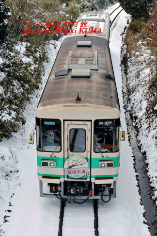 信楽に着いた列車は、僅かな停車時間ののち、再び折り返してまいります。同じ場所で撮影するのも芸がありませんので、速やかに撤収してポイントを移動いたします。しかし、信楽高原鉄道って、どこでも撮れるようで、意外と撮影ポイントは限られるねんな、と妻に話しながら、ここはと思った交差点でハンドルを切りました。線路に近づいていくと雪の量が増えてまいります。とはいっても、雪をほとんど見ることがない大阪人の目から見たもので、豪雪地帯の人に言わせれば、これくらいの雪など、可愛らしいものかもしれません。次の列車は橋の上から俯瞰するアングルで狙うことにいたしましたが、列車通過後、モニターチェックをして「盆梅列車」のヘッドマークをつけていることに気づきました。盆梅展というと北陸本線の長浜が有名で、それしか知らなかったわたくしは、信楽でもやっていることが新鮮な驚きでありました。梅かあ~、匂いが良いねんな。後追いのカットをよく見ると、運転室・車掌室の中にも盆栽の梅が置かれているではありませんか。馥郁たる梅の香りが漂ってくるようでありました。撮影地:信楽高原鉄道信楽~玉桂寺今日3月1日は、ビキニデー、労働組合法施行記念日、マーチの日/行進曲の日、防災用品点検の日、豚の日、省エネルギーの日、安全衛生総点検日、家庭塗料の日、水天の縁日、妙見の縁日だそうです。
